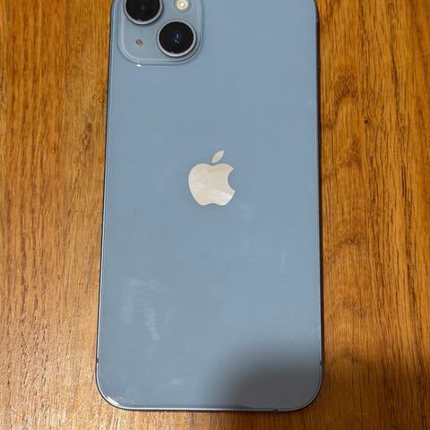 Apple iPhone 14 älypuhelin, jossa on 128 gigatavua tallennustilaa. Puhelimessa on naarmuinen näytönsuoja, joka näkyy kuvissa. Väri on vaaleansininen.