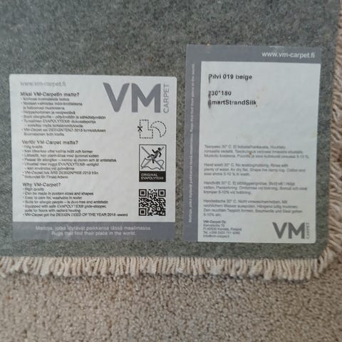 Kotimainen VM-Carpetin Retro-matto esimerkiksi eteistilaan. Kestävä, julkisissakin tiloissa käytettävä laatu. Kantattu kaikilta sivuilta. Matossa liukumaton Evapolytex-pohja, joka pitää maton hyvin paikoillaan. Kokonaisilmeeltään hyvin siisti ja pesty vastikään. Mittatilauskoko, joten poikkeaa vakiomitoista. Ensimmäisessä kuvassa näkyvä vaaleampi kohta on painauma penkin jalasta, ei kulumaa. Toisessa kuvassa näkyy tarkemmin maton väritys. Yleisilme on antrasiitin harmaa. Tupakoimaton talous, jossa ei lemmikkejä.