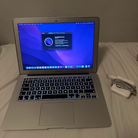 Apple MacBook kannettava tietokone harmaa. Mukana virtalähde ja latausjohto.