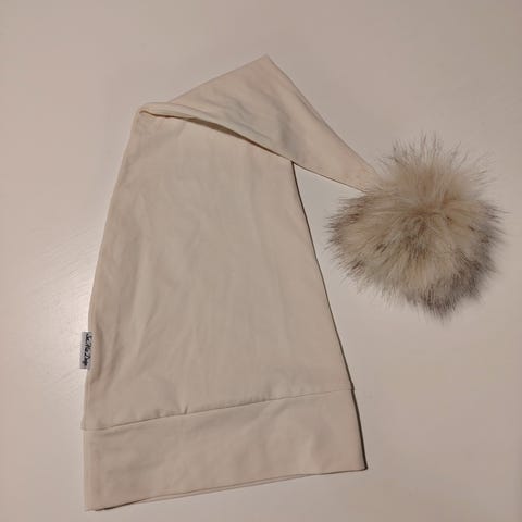 Kerran päässä ollut tonttulakki tupsulla, sävyssä kaneli. Uudenveroinen. Mitat näkyy kuvasta, sopii n. 2-6 vuotiaalle. Kotimaista käsityötä🤍 Postitus vuorokauden sisällä, ehtii vielä jouluksi!
