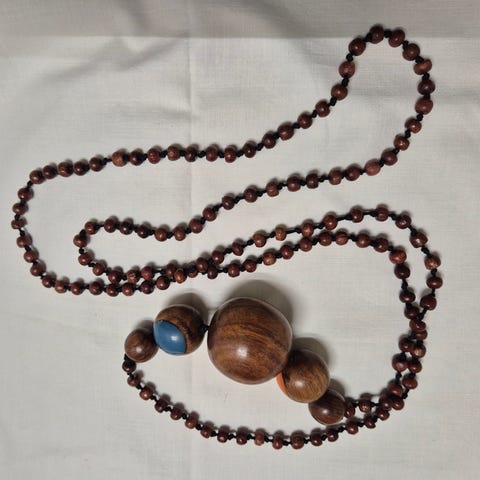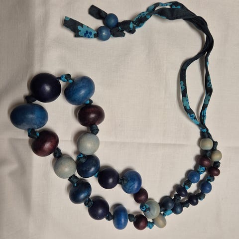 Marimekon tyylikäs kaulakoru puuta ja muovia. Nauhan pituus 55 cm. Väreinä upea vadelmanpunainen, syvä vihreä ja oliivi teakin väristen puisten helmien kanssa. Sopii monenlaisten asujen kanssa. Mukaan Marimekon kankainen korupussi.