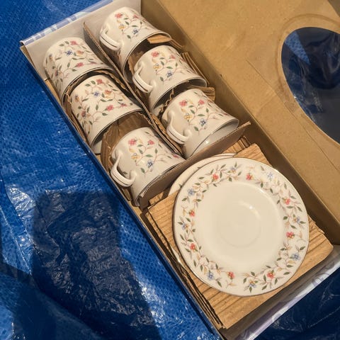 10 kpl kaunista käsinmaalattua kakkulautasta. Kultaus on ehjä ja kauniissa kunnossa. Lautaset ovat olleet lähinnä koristeina. Sopii täydentämään kattausta hyvin, halkaisija 16cm.