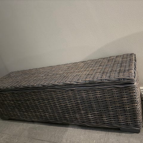 Tukevasta kiiltäväpintaisesta valkoisesta levystä rakennettu laatikko. Leveys 220 cm x syvyys 70 cm x korkeus 55 cm. Oikeanpuoleinen kansi on avattava, vasemmanpuoleinen on kiinteä. Sopii vaikkapa suurempien tekstiilien säilyttämiseen. Laatikko on nyt purettu osiin siirtämisen helpottamiseksi. Ruuvit, saranat ym tilpehöörit ovat tallessa.