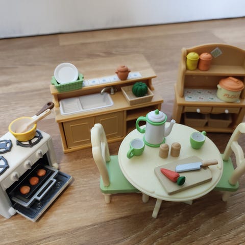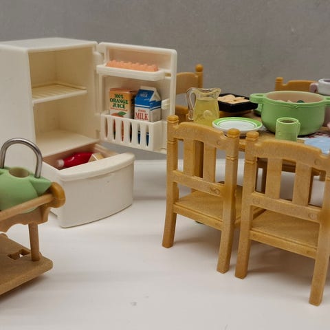 Sylvanian Families ruokailuryhmä jääkaapilla ja tarvikkeilla