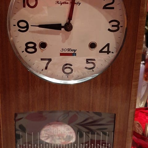 Kuvan mukainen vedettävä, toimiva seinäkello. (Kuvissa kello ei ole seinällä. Heiluri ei ole paikallaan kaikissa kuvassa.)