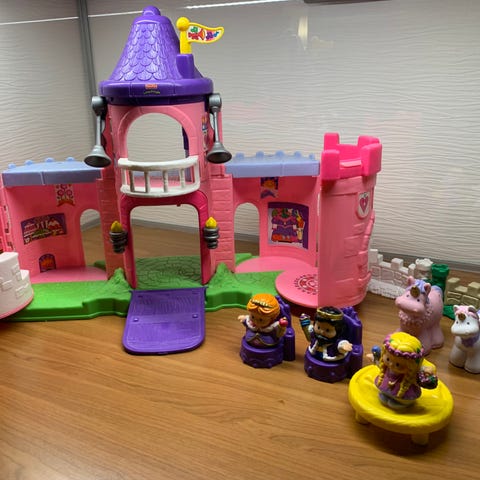 Fisher-Price linnaleikkisetti, ukkeleita erilaisia n. 20, toimiva salattu tykki, avautuva torni, pakokäytävä.