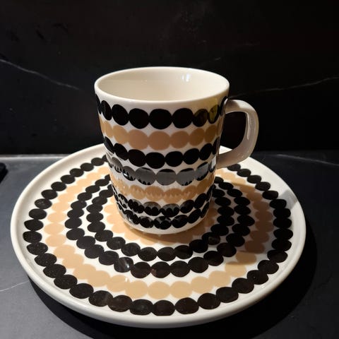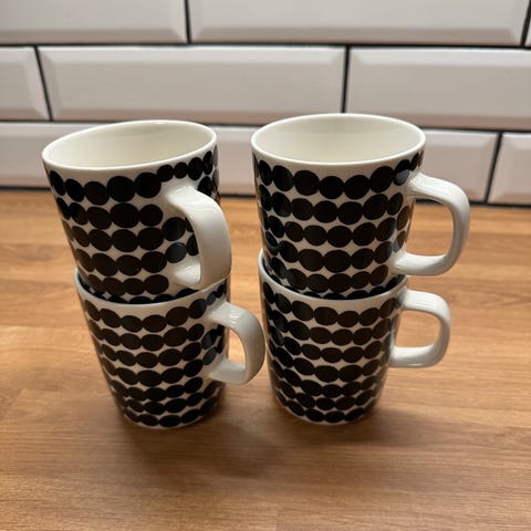 Marimekko Siirtolapuutarha -sarjan 4dl mukit, 6 kappaletta. Väri musta ja valkoinen. Saa myös tarjota hintaa.
