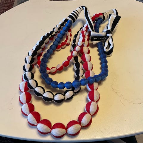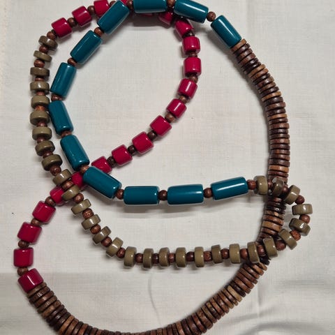 Marimekon tumman viininpunaista kovamuovia olevat palakäädyt ja -korvikset. Käädyt noin 45 cm ja korvikset noin 10 cm. Tyylikkäät juhlakorut.