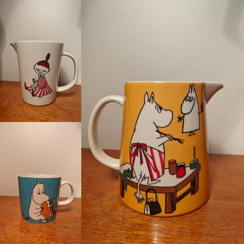 Arabia Moominwalley; Viimeinen lohikäärme, Kultainen häntä, Yksin kotona sekä Taikatalvi. Nuuskamuikkunen ja tulenhenki sekä Muumimamman muraali mukeissa tarrat. Myydään vain yhdessä. Mahdolliset postituskulut lisätään.