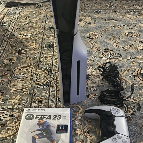 Sony Playstation 5 pelikonsoli valkoisella ja mustalla värityksellä. Konsoli sisältää kaksi langatonta ohjainta, joista toinen on vaaleanpunainen ja toinen valkoinen. Liitännät ja kunto näkyvät kuvissa. Kuittia ei oo enään tallessa ostettu verkkokaupasta!