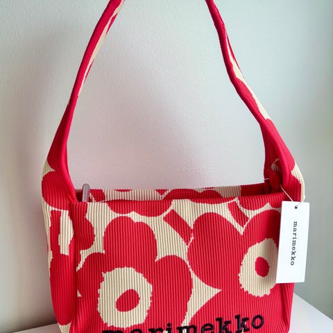 Knitted Bag Large -olkalaukussa on jacquard-kudottu Unikko-kuosi, ja se on valmistettu ryhdikkäästä kierrätetystä polyesterista, jossa on raidallinen pinta. Isossa laukussa on leveä olkahihna, se sulkeutuu sidottavilla nauhoilla ja siihen on brodeerattu Marimekko-logo toiselle puolelle.