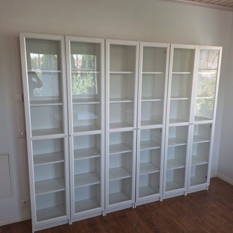 Myynnissä lähes uusi Billy-hylly, jossa ovet. Ovien yläosa vitriiniä ja alaosa paneelia. Sisällä 6 kpl hyllyjä.
