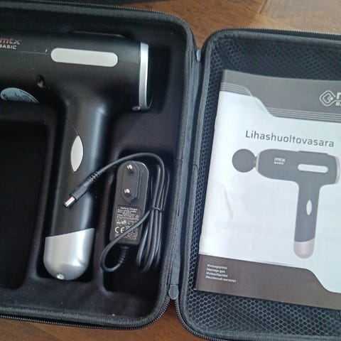 Pidennetty kahva helpottaa selän ja hartioiden hieromista. Värinälle on viisi eri tasoa. Mukana tulee neljä hierontapäätä, joista yksi on mahdollista lämmittää tai viilentää. Myös USB-latausjohto mukaan, vaikka ei kuvissa näy.
