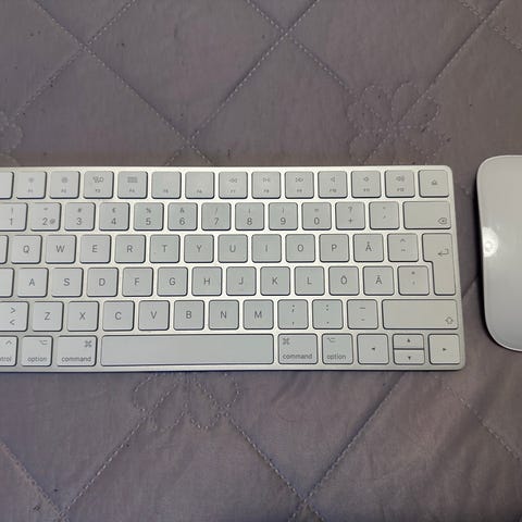 Apple Magic Keyboard ja Magic Mouse 2 ovat langattomia laitteita, jotka on suunniteltu yhteensopiviksi Applen laitteiden kanssa. Näppäimistö on valkoinen ja valmistettu kestävästä materiaalista. Magic Mouse 2 on hopeanvärinen ja ergonomisesti muotoiltu hiiri. Molemmat laitteet toimivat ladattavalla akulla. Kaikki: 50e. Nouto Hämeenkylästä, Vantaa.