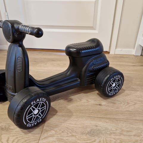 Myydään sisällä käytössä ollut potkumopo hiljaisilla renkailla. Mopolla ajeltu paljon, joten käytön jälkiä löytyy. Ohjaussarviin tullut halkeama, muttei haittaa käyttöä (ks. kuva).