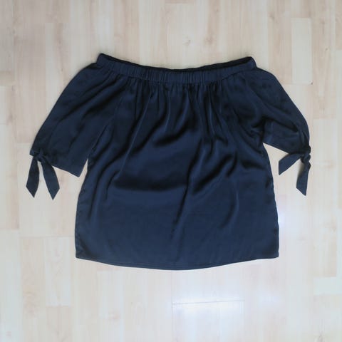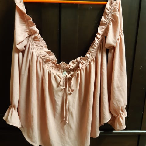 NLY TREND beige off-shoulder paita kokoa 38. Sopii S-M. Levenevät hihat, jotka joustavat rypytysten kohdalta. Paidan saa edestä keskeltä ”kiristettyä” narujen avulla, jolloin paita ns. lyhenee edestä. Kuin uusi.