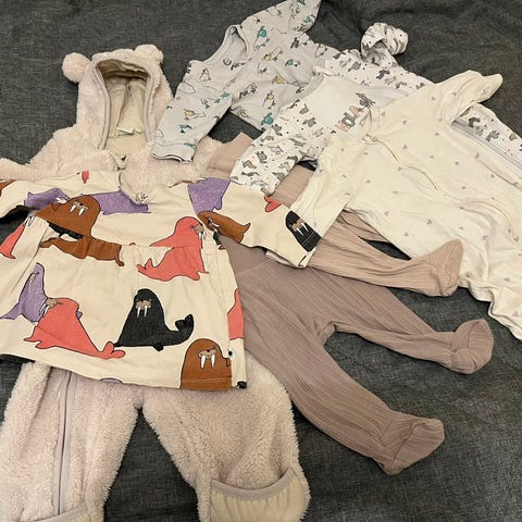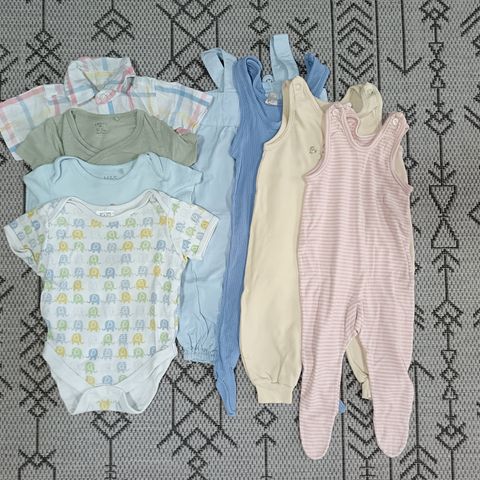 Myydään pakettina yhteensopivat vaatteet vauvalle. Potkuhousut (50/56) reilua kokoa, sanoisin että vaatepaketti sopii 62-kokoa käyttävälle.