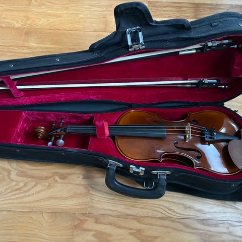 A. Schroetter (Andrew Schroetter) 1/2 (2/4) koon viulusetti. Kova kotelo, viulu suoraan soitosta, leuka- ja olkatuet, jousi ja hartsi.