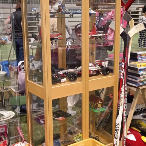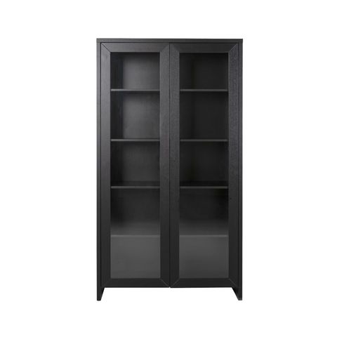 Vitriinissä on lasiovet ja lasihyllyt. Tumma, lakattu puupinta.