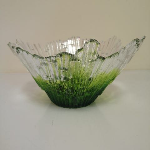 Lasimalja ruskean ja kirkkaan värin yhdistelmällä. Malja on valmistettu lasista ja siinä on aaltoilevat reunat.
