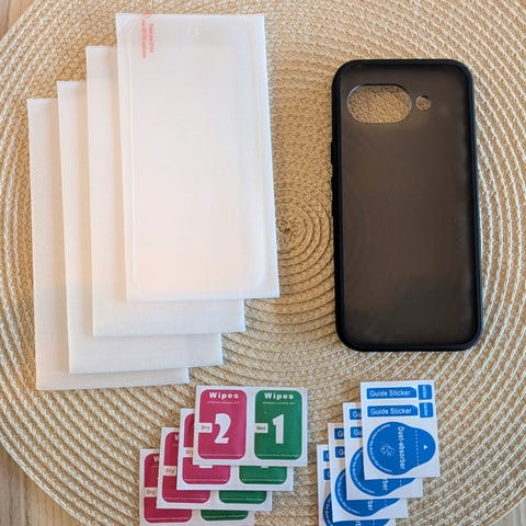 Käyttämättömät Google pixel 7A -puhelimen suojakuori ja suojakalvot (2kpl).
