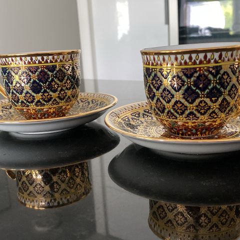 Käsinmaalattu kahviastiasto, jossa kultaukset