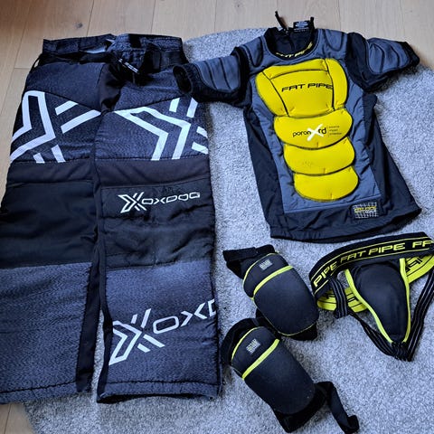 Salibandy maalivahti. Lasten 146 cm suojapaita, jossa on musta, punainen ja valkoinen väritys. Pitkähihainen malli, joka tarjoaa suojaa rinta- ja hihatoppausten ansiosta. Et tarvitse erillistä rintapanssaria. Hyvä kunto. Selässä painatus nro 4.