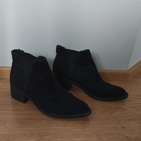 Hyvässä kunnossa olevat mustat korolliset nilkkurit. Olleet vain muutaman kerran jalassa. Muuten moitteettomat, mutta oikean kengän koron yläpuolella pieni kuluma. Näkyy toiseksi viimeisessä kuvassa.