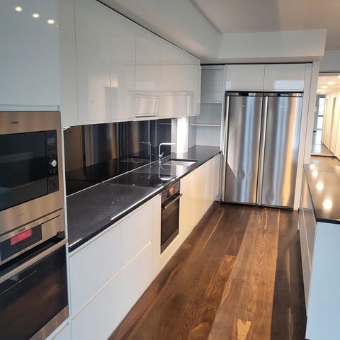 Kaapistot tumma tammiviilu ovella. Yläkaapit puhdas valkoinen kiiltävä.
