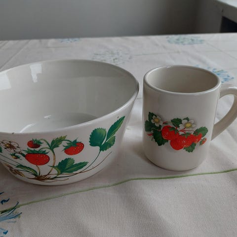Kaunis ja harvinainen mansikka-astiasto, jota olen kerännyt pikkuhiljaa.