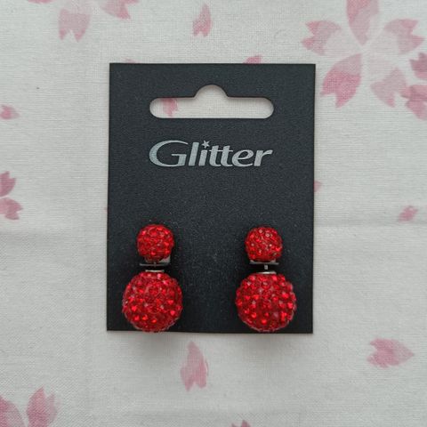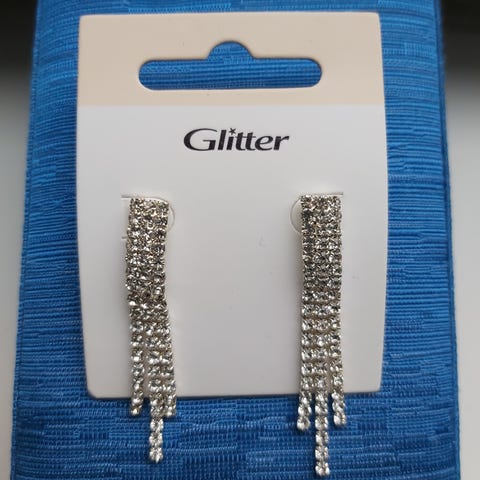 Glitterin hopeanväriset kimaltavat korvakorut. Pidetty ehkä kerran, ovat kuin uudet ja kaikki strassit tallella.