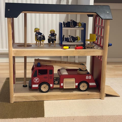 Aseman voi sisustaa mukana tulevilla tavaroilla, paloauton saa ajettua talliin sisälle, katolle voi laskeutua helikopterilla, paloauton kyytiin mahtuu kaksi palomiestä, tikkaita pitkin pääsee kiipeämään ylös, poliisiauto ja poliisin kyltti täydentävät leikkiä... Valmis leikkisetti vaikka pukinkonttiin!