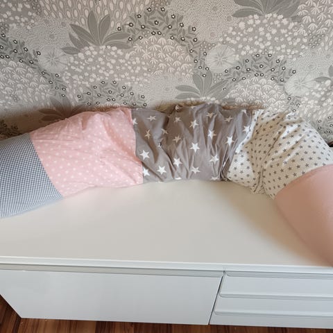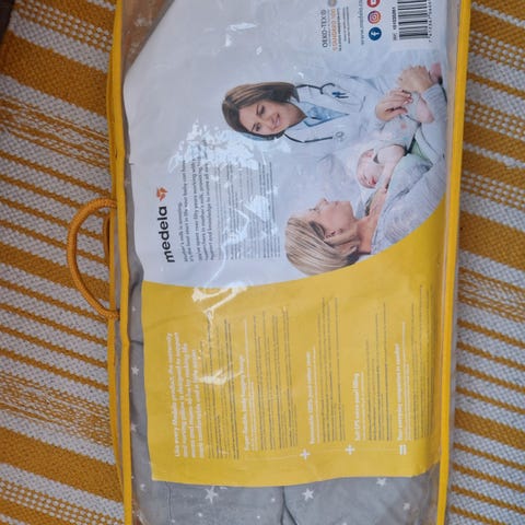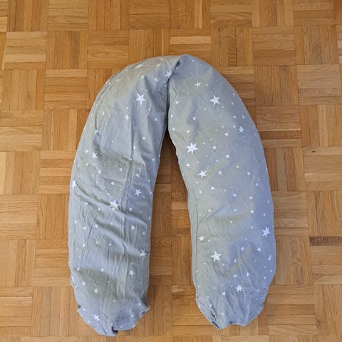 Medela imetystyyny harmaalla tähtikuvioidulla päällisellä. Päällinen sekä tyyny ovat vesipestäviä. Ostettu uutena ja ollut käytössä n. 4 kk.
