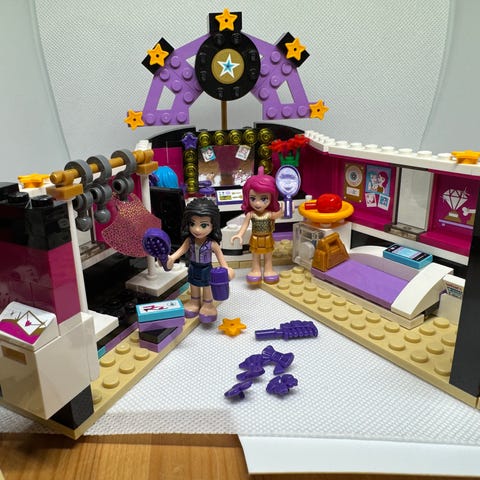 Mukaan saa Poptähden pukuhuone setin 41104. Tämä ei ole enää uudenveroinen. Joissain paloissa pientä kulumaa ja haalistumaa. Pieniä osia puuttuu. Ohjekirja mukana.