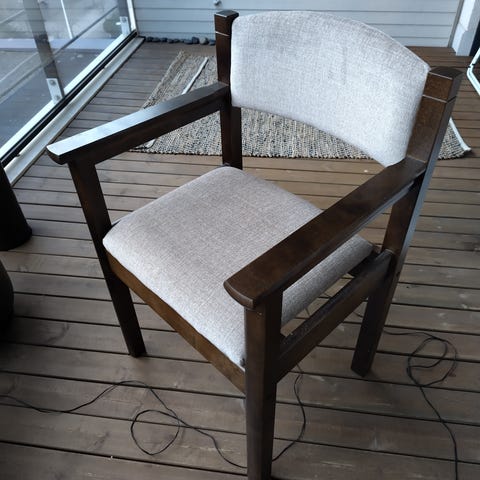 Pehmustettu istuinosa. Tukevat käsinojat.