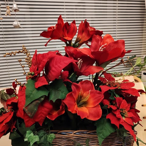 Silkkisiä kestäviä JOULUKUKKIA korissa.
