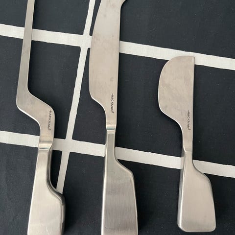 Hackmanin juustoveitsisetti sisältää veitset kovalle, pehmeälle sekä levitettävälle juustolle. Veitsien mitat 22 cm, 15,5 cm, 13,5 cm.