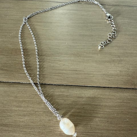 Kevyt kaulakoru, valmistettu ohuesta teräsketjusta ja koristeltu kevyillä helmimäisillä muovipalloilla.