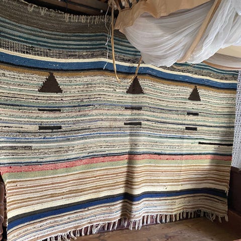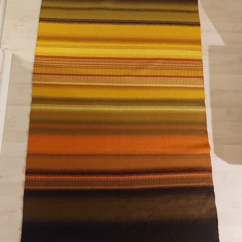 Hyväkuntoinen upean värinen metsän vihreä iso raanu jossa mm. violetti raita antaa kivan yksityiskohdan. Yleisilmeeltään tosi siisti ikäisekseen. Katso kuvat. Leveys 93 cm korkeus 145cm +hapsut. Voi laittaa seinälle, nojatuoliin tai vaikka lattialle matoksi.
