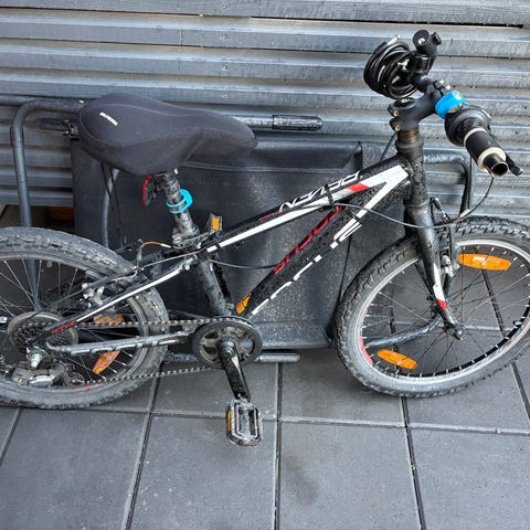 Focus Raven lasten polkupyörä, 20 tuuman renkaat ja vihreä runko. Pyörä sopii lapsille ja siinä on jarrut ja vaihteet, jotka näkyvät kuvissa.