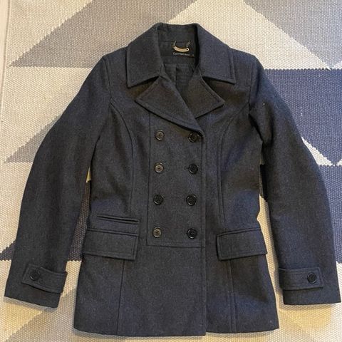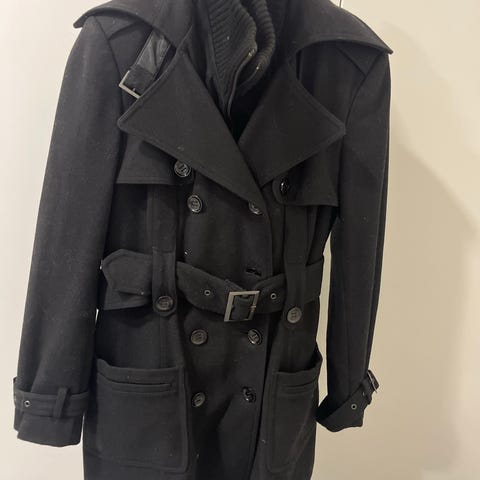 Tummanpunainen Calvin Kleinin duffelitakki. Edessä vetoketju, nepparit ylhäällä ja alhaalla sekä solkikiinnitys. Irroitettava huppu, tässä nappikiinnitys. Povitasku. Takin etutaskujen ompeleet avaamattomat, joten taskut yhä ryhdikkäät. Kankaan tekstuuri "nyppyistä", käytössä kankaalle muodostunut nukka poistettu ennen myyntiin laittoa.