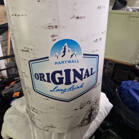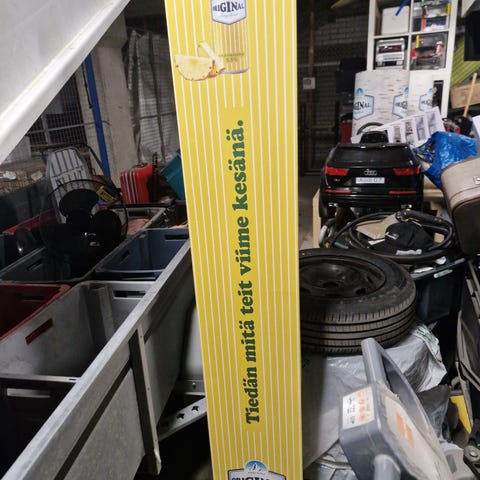 Hieno korkea pahvinen myymälärekvisiitta lonkerotölkistä.Korkeus reilusti toista metriä