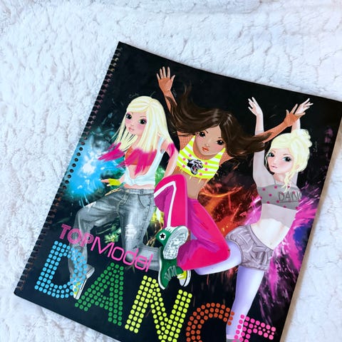 Top Model lasten leikkikirja sisältää sivuja piirustukseen ja asujen suunnitteluun, erilaisia sabluunoita ja useita tarroja. Kirja on tarkoitettu lapsille ja tarjoaa mahdollisuuden luovaan leikkiin ja askarteluun.