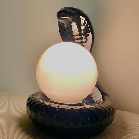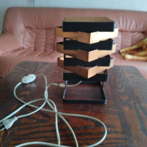 Musta käärme lamppu 1970-1980-luvulta. Muuten täysin ehjä ja toimiva kapistus, mutta pallo-osa on mennyt muutossa rikki ja se on liimattu. Ajattelin käyttää siihen kultamaalia japanilaisen kintsugi korjauksen tyyppisesti, mutta se sitten jäi tekemättä, kun ei tälle oikeastaan ole enää tilaa uudessa kodissa, mutta siinä yksi esimerkki seuraavalle miten voisi tuunata halutessaan.