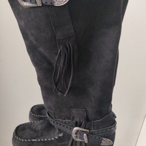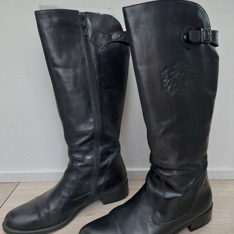Mustat, korkeavartiset saappaat, joiden ulkopinta on synteettistä materiaalia. Niissä on tukeva, uritettu kumipohja ja lämmin tekstiilivuori.Koko on 41.Väri: mustaMateriaali: synteettinen, kumipohja, tekstiilivuori