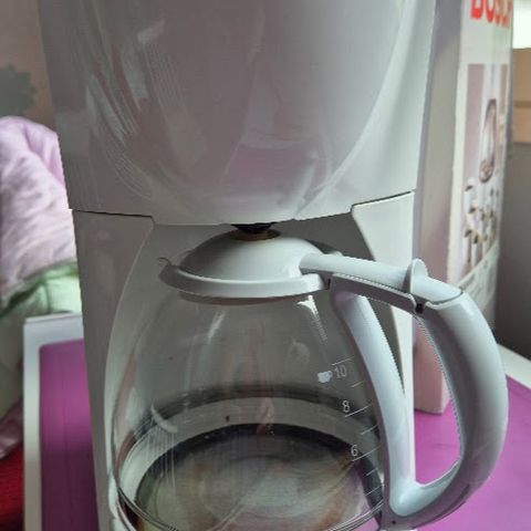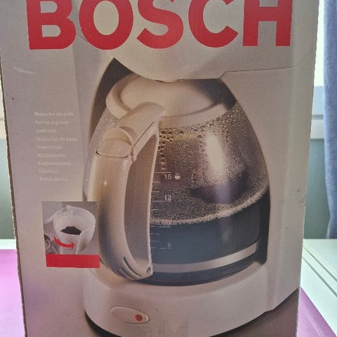 Ylimääräiseksi jäänyt Boschin kahvinkeitin. Käytönjälkeä löytyy (esim. logo kulunut) mutta on hyväkuntoinen ja toimiva laite. Irrotettava vesisäiliö on helppo täyttää ja puhdistaa.