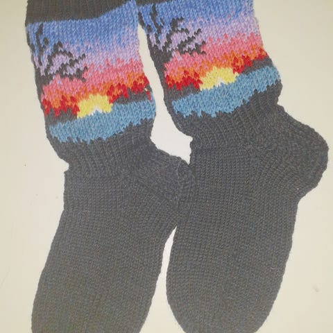 Villasukat 7 veljestä langasta. Varren mitta 36 cm ja jalkaterä 25 cm. Postikulut tarvittaessa 6e s-kokoisessa paketissa tai vaihtoehtoisesti Toridiilin kautta.
