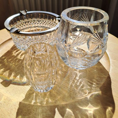 Kristallista valmistettu tuhka-astia, jossa on kauniita leikkauksia ja kuvioita.