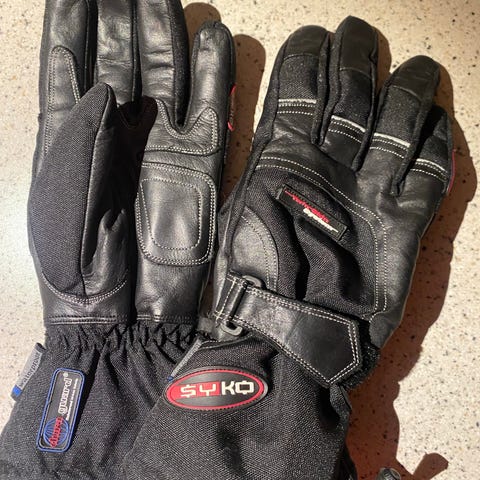 Käyttöä nähneet mutta silti pätevät hanskat. Lämpimät mutta tarvittaessa alle mahtuu vielä aluhanskat. Kuvassa näkyy yhden sormen kohdalla oleva pieni reikä.