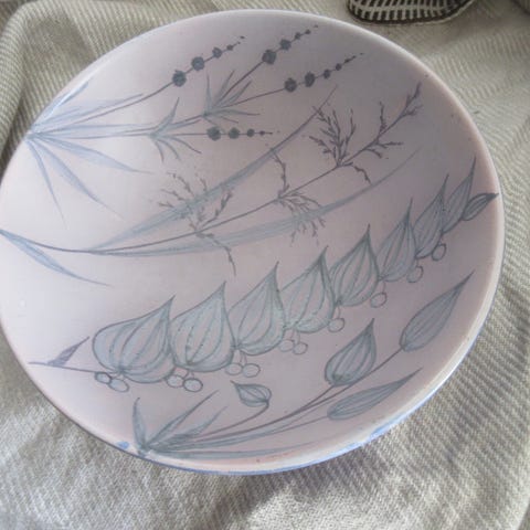 Hakusanat: astiat, lautaset, vadit, seinälautaset, fajanssi, kasvit, kukat, Kupittaa, Kupittaan Savi, retro, vintage, design, Turku, Turku design. Lähetän.